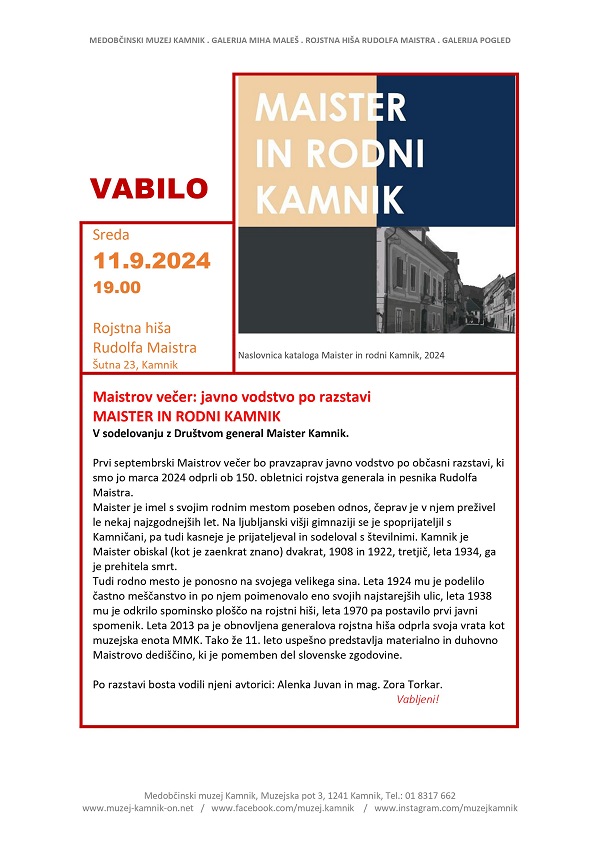 Prvi septembrski Maistrov večer bo pravzaprav javno vodstvo po občasni razstavi, ki smo jo marca 2024 odprli ob 150. obletnici rojstva generala in pesnika Rudolfa Maistra.