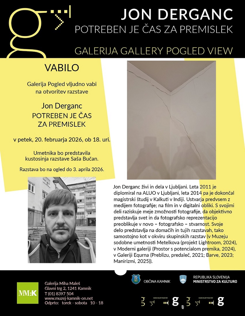 Razstava Potreben je čas za premislek umetnika Jona Derganca v enoten projekt združuje več raznolikih umetniških pristopov, v katerih se avtor ukvarja z vprašanjem položaja in smisla umetnosti v sodobnem času, zaznamovanem z nenehno produkcijo in potrošnjo podob. V svetu, kjer so na raznovrstnih medijih vizualije stalno prisotne, je na mestu umetnikovo vprašanje, kaj sploh še lahko nastane v umetnosti in kakšne možnosti ima umetnik za kreiranje še nevidenega. Derganc v svojih delih uporablja fotografijo, ki jo manipulira in s tem oddaljuje od njene dokumentarne funkcije. Pomembno vlogo ima tudi monokrom, skozi katerega raziskuje razmerje med slikarstvom in fotografijo ter briše meje med obema medijema.