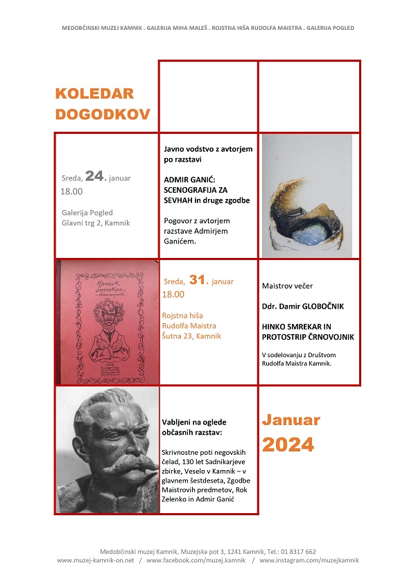 Ddr. Damir Globočnik nam bo na prvem Maistrovem večeru v letu 2024 predstavil knjižico, strip, protostrip pravzaprav – Hinko Smrekar, Črnovojnik, ki je izšel leta 1919 pri založništvu Umetniška propaganda. V njem je naš veliki slikar in ilustrator po končani prvi svetovni vojni lucidno, s švejkovskimi prijemi upodobil svojo usodo in zgodbe znanih Slovencev, tudi svojega dobrega prijatelja Ivana Cankarja.