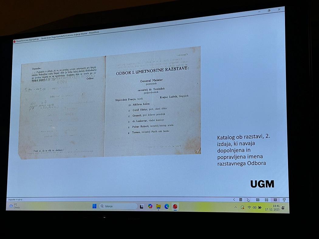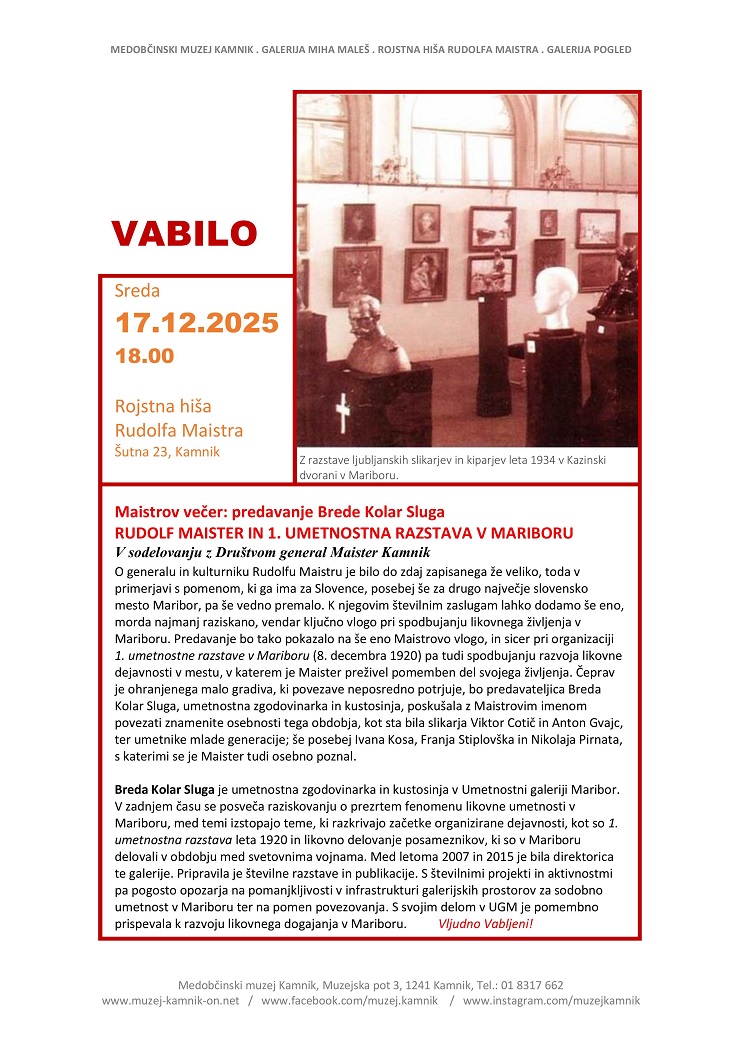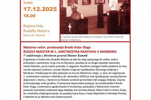 Predavanje bo tako pokazalo na še eno Maistrovo vlogo, in sicer pri organizaciji  1. umetnostne razstave v Mariboru (8. decembra 1920) pa tudi spodbujanju razvoja likovne dejavnosti v mestu, v katerem je Maister preživel pomemben del svojega življenja. Čeprav je ohranjenega malo gradiva, ki povezave neposredno potrjuje, bo predavateljica Breda Kolar Sluga, umetnostna zgodovinarka in kustosinja, poskušala z Maistrovim imenom povezati znamenite osebnosti tega obdobja, kot sta bila slikarja Viktor Cotič in Anton Gvajc, ter umetnike mlade generacije; še posebej Ivana Kosa, Franja Stiplovška in Nikolaja Pirnata, s katerimi se je Maister tudi osebno poznal.