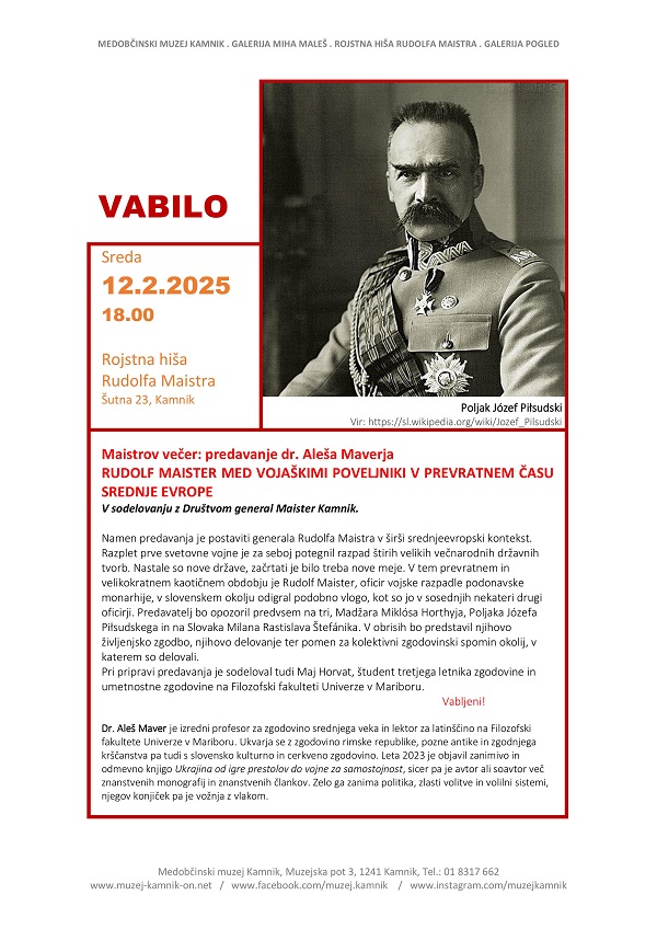 Namen predavanja je postaviti generala Rudolfa Maistra v širši srednjeevropski kontekst. Razplet prve svetovne vojne je za seboj potegnil razpad štirih velikih večnarodnih državnih tvorb. Nastale so nove države, začrtati je bilo treba nove meje. V tem prevratnem in velikokratnem kaotičnem obdobju je Rudolf Maister, oficir vojske razpadle podonavske monarhije, v slovenskem okolju odigral podobno vlogo, kot so jo v sosednjih nekateri drugi oficirji. Predavatelj bo opozoril predvsem na tri, Madžara Miklósa Horthyja, Poljaka Józefa Piłsudskega in na Slovaka Milana Rastislava Štefánika. V obrisih bo predstavil njihovo življenjsko zgodbo, njihovo delovanje ter pomen za kolektivni zgodovinski spomin okolij, v katerem so delovali.