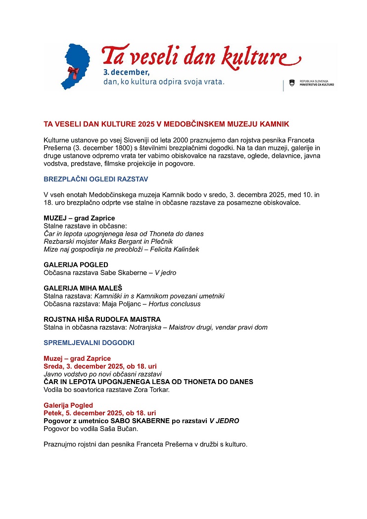 Kulturne ustanove po vsej Sloveniji od leta 2000 praznujemo dan rojstva pesnika Franceta Prešerna (3. december 1800) s številnimi brezplačnimi dogodki. Na ta dan muzeji, galerije in druge ustanove odpremo vrata ter vabimo obiskovalce na razstave, oglede, delavnice, javna vodstva, predstave, filmske projekcije in pogovore.