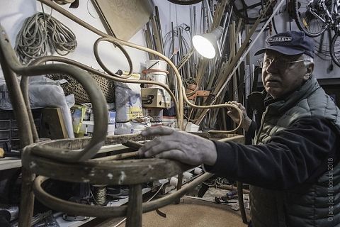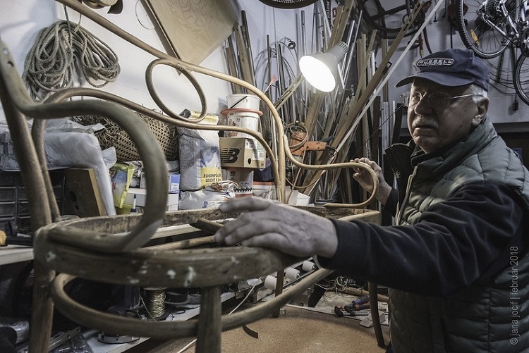 The private collection of Ilona and Jurij Rihar began to take shape in the 1980s, when they restored a damaged Thonet bench and embarked on a long journey of collecting and restoration. Jurij comes from a family of carpenters—he inherited a deep understanding of wood and developed his skills independently. Today, the collection includes more than 250 pieces, each the result of precise handwork: disassembling, bending replacement parts, sanding, varnishing, and reassembling. Of particular value are the handwoven rattan seats, which Jurij creates using original patterns, passing on this rare craft in collaboration with his family. Each item in the collection carries its own story—not only of its making, but also of its use and the people who once used it.