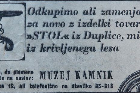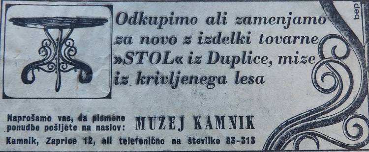 The history of the Thonet furniture collection in Kamnik dates back to the 1960s, when engineer Franc Možek, in cooperation with the furniture company Stol Kamnik, initiated the collection. At that time, the museum published newspaper ads encouraging the public to donate or sell furniture; the factory restored the pieces and sometimes exchanged them for new ones. The collection grew quickly and today includes more than one hundred items by various manufacturers, including rare technical tools, prototypes, and catalogs. It is one of the most important collections of its kind in the European context.
